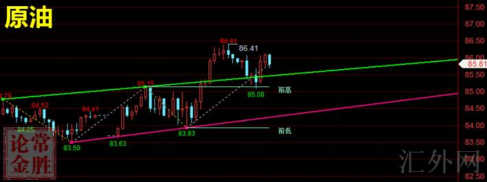 原油夜里分析:从技术角度来说,原油成交量昨日涨到高点之上,并持续在正向线上收盘上升。经历亚欧板块的横向动能后,美国板块的交易量直接站在前一高位,高达86.96,收在高点。