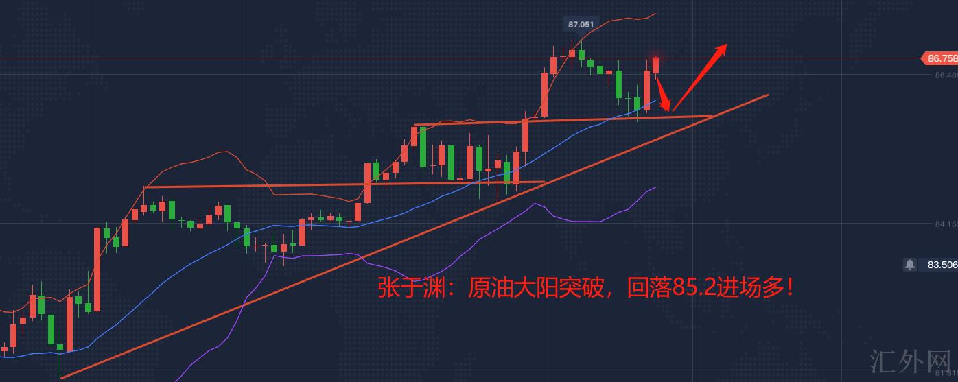 这周迄今原油价格已经刷新了近七年的高峰,WTI原油今天到达了87的位置,短时间没有基本分析的更改,原油保持趋势上升的几率依旧异常高。昨天发布的OPEC月报保持了对石油消费的积极前景,预期2022年世界原油需求增速预计为420万桶每日,与在此之前统一;2022年世界石油消费为1.008亿桶每日。此外,俄罗斯和乌克兰的剑拔弩张也致使欧洲天然气价格暴涨,要知道去年原油价格一口气立稳80美元就是被天然气给动员起来的。原油当前持续的在击穿高峰,从日K线到各周期均线体系买方排列,布林带指标也是三轨平行上升,尽管总体强弱指标RSI表明接连超买,但仍未形成背驰,所以当下言大顶稍微为时过早。原油小时线呈现60度角的倾斜往上,低位持续的在提升,斜率倾斜往上,同期接连的大阳线,收盘价也是呈现逐渐加大的痕迹,k线全部踩着中轨上涨,顺势回调85.2左右买涨!