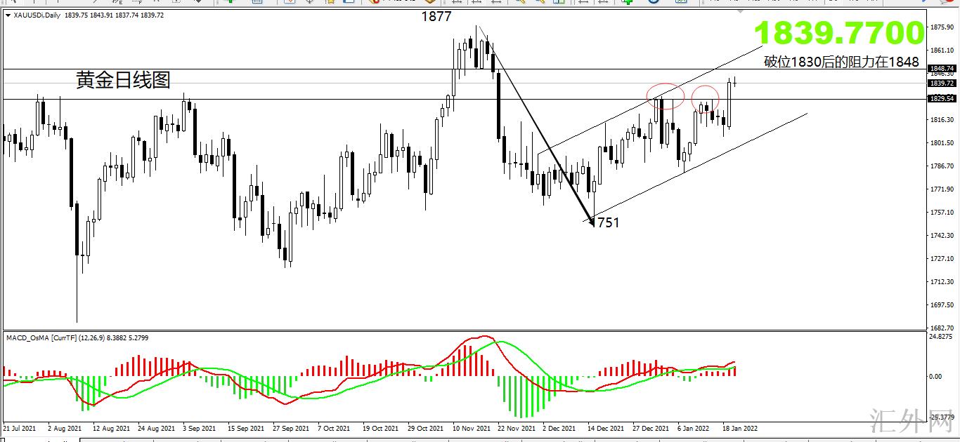 那么对于当下的日K线该如何操作呢,一般在突破后面,我们需求关注行情的保持性,上升分强分弱,弱势上升击穿后会又一次调动休息,随后再向往上击穿位,强劲行情则每天持续的适当攀高峰,当下的日K线局势,还运行在震荡的上涨通道中,是一个显著的弱势上升, 那么我们在短时间内关注通道上缘1848以及1852区间的压力即可,这个位置也是以前在1877形成的双顶颈线位置,这周只有击穿这一带区域,才可进入强劲上升期,以下的核心支撑在1826,尽管以前黄金价格遇阻的位置在1830,但是实体突破的位置实在1826,这里才是事实支撑。