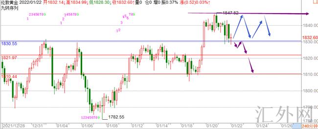 1:4小时临时在1830上下的中轨道支撑,同期也是顶底转换的支持点置上,形成了支撑,这个支撑临时会支撑黄金持续处在高点的区域震荡当中。高点的区域分别是1830的支持,以及1850的阻力,形成20美金的区域整理。、所以,最后星期五,金科的信号是——星期五不会痛跌,也不会大涨,高点区间1830-1850的区域为主整理。