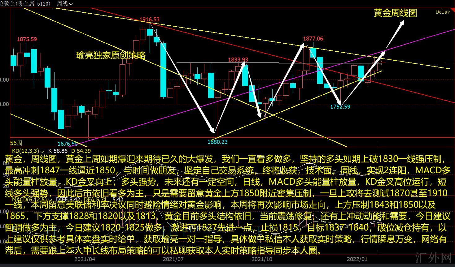 黄金,周线图,黄金上周按计划爆面临期望已久的大暴发,我们一直看涨买涨,坚持的买方按计划往上击穿1830一线强抑制,最高冲刺1847一线逼差不多1850,与时间做朋友,坚定自己交易体系,终将收获,技术分析,周线,达到2连阳,MACD买方能量柱放量,KD金叉往上,买方强劲,将来仍有一定空间,日K线,MACD买方能量柱放量,KD金叉高点运行,短线买方强劲,所以后市依旧看涨为主,导致需求留心黄金上方1850左右密集抑制,一旦上探将去试探1870甚到1910一线,这周留心美联储利率会议同期避险情绪对黄金影响,这周将又一次影响市场走势,上方抑制1843和1850以及1865,以下支撑1828和1820以及1813,黄金当前买方结构依旧,目前震荡修复,仍有上冲动量能和需求,今日推荐回踩买涨为主,今日推荐1820-1825买涨,激进可1827先进一点,止损1815,计划1837-1840,突破减仓持有,以上推荐仅供参考具体实盘实时给单,获取瑜亮一对一指导,具体做单私信本人获取实时策略,行情瞬息万变,网络有落后,需求跟上本人中长线布局策略的可以私聊获取本人实时策略指导同步本人圈。