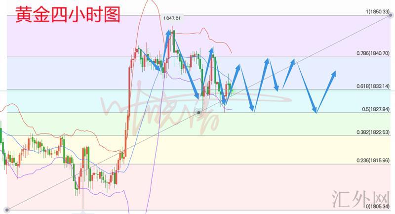 4小时探高后回测在此之前的区域击穿口1830.当前短线结构临时收在之上,在此之前伴随了二次探高再收低的走法,致使今天仍是一个核心的争夺时间点,同期配合日第三个交易日强弱转换,早盘依旧稳健点先观望,把时间点放到欧元兑美元盘。小周期处在上涨通道中运行,亚欧盘着重注意1830.欧盘后守稳1830上方则择机看涨。反之朝下击穿的话。则要先下探。美盘再择支撑启稳。短线拉锯反复,卡点比方向更核心。支撑1828-1830左右,其次再看1820.布林带轨道偏下运行,开口持续维持朝下运行,早上黄金价格的开盘价也是处在压力位1834左右,位于压力位以下,macd能量柱远离零轴,逐渐朝下,回弹1840左右可空。