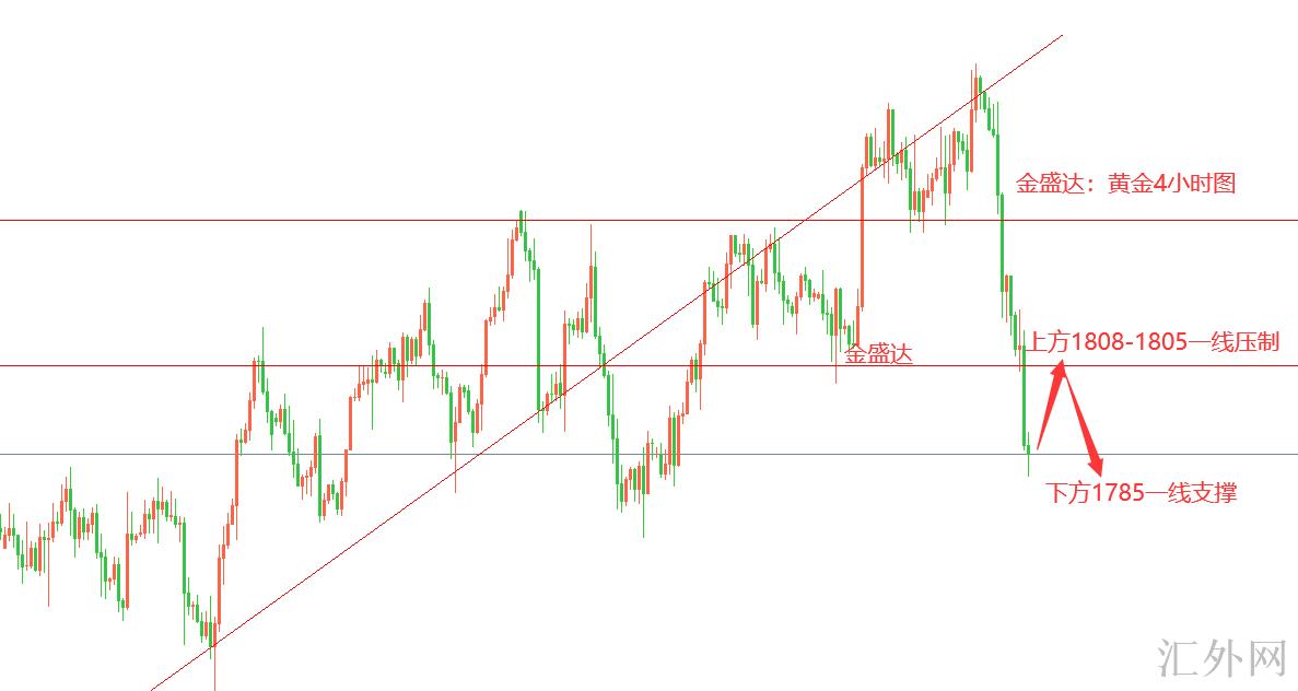 4小时回调失守中轨且跌穿1805,此位是买方短线临界点,突破即更改上涨趋势,同期昨日还朝下击穿了上涨趋势线的支持,且收盘在趋势线之下,打破了这段上涨通道,诚然首要依旧受消息面的影响更改了技术结构形态。4小时迈出一次连阴下挫,突破后今日短线1805由支撑转为压力,短线回弹在此位之下择机先驱看跌。综上所述,今日黄金操作上金盛达推荐短线推荐回弹高空为主,回踩低多为辅,上方着重注意1805-1808一线压力,以下短时间着重注意1780-1782一线支撑。具体操作策略我会在盘中提示,及时关注。最近市场动荡程度较大,机会与风险并存。控制风险再博收益。