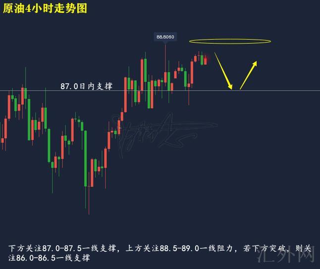 原油技术分析来分析,日K线上,星期一原油白盘展开下挫,并在低至MA10日移动均线后展开回涨,报得带下影线的中阳,日K线上,今日行情持续上升,恐会持续回调依托MA5-10日移动均线上涨;4小时上,星期一原油在经历下挫至下缘位置后走震荡上涨行情展开上升,目前布林带处在开口期,MA均线三线向前,KDJ随机指标三线往上,到达超买,MACD指标红色量能柱显现,快慢线平行向前,综合来说,原油即使当前日K线支撑维持不错,但均线面面对超买,日间交易参考高空低多,上方注意88.5-89.0一线压力,以下注意87.0-87.5一线支撑,若以下显现击穿则在依托86.0-86.5左右买涨。