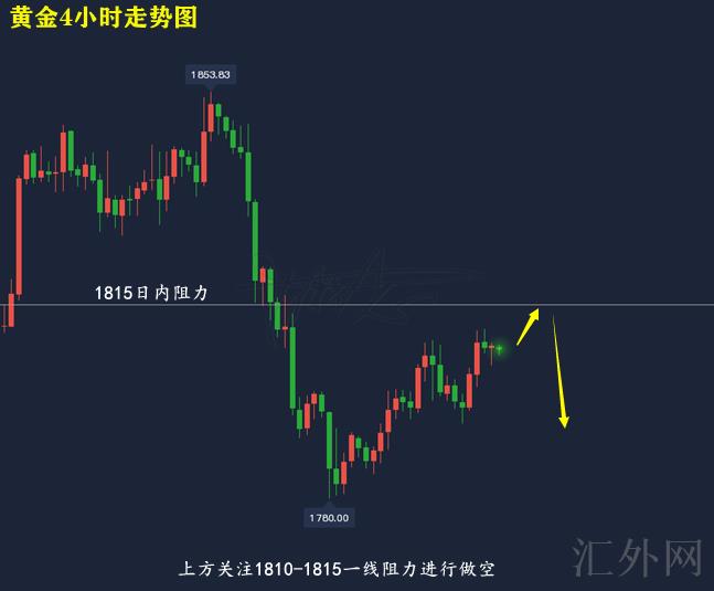黄金技术分析来分析,日K线上,星期三黄金保持前几个交易日上涨趋势,又一次上涨,报得带上下影线的中阳,日K线上,即使行情三连阳上升,但均线MA10抑制仍未打破,日间可持续维持看跌;4小时上,星期三黄金亚盘震荡下探短线跌穿中轨后回涨,并在刷新上缘后又一次适当回调盘整,目前布林带处在开口期,MA均线迈出金叉,KDJ随机指标三线向前,到达超买,MACD指标红色量能柱适当缩量,快慢线平行向前,综合来说,黄金当前仍未打破大级别抑制以及周线均线抑制,日间交易参考买跌,上方注意1810-1815一线压力。