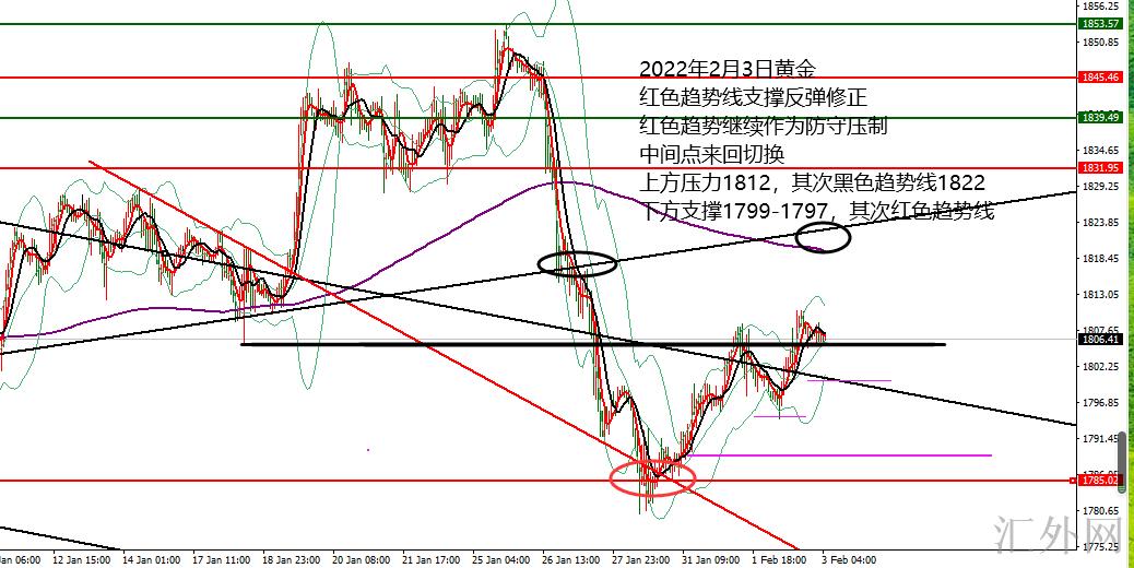 第一,黄金日K线级别,自上星期五收报长下影一定持稳形态后,这周初接连三日连阳回弹,最高刷新1810一线,这也符合底部偏空整理;一面,是因为于以下趋势做多盘支撑逐渐攀升,1780再突破向下空间不大;另一面,是因为于前面刚大幅下挫,短时间回弹会遇阻10均线下运行几日时间,起码第一次刷新会有一定遇阻作用;所以,这几日多半还会持续底部内区间震荡,在10日和中轨两压力未击穿立稳以前,回弹会偏空,也存在底部1780上下又一次的试探几率;只有击穿立稳10日和中轨,才可走强回弹,又一次进攻1830及上方,整个2月份大差不差是一个宽幅运行不变;目前,10日和中轨压力下探到1815一线,关注此位置的得失情形,决定短时间回弹的强弱改变,支撑5日1800逢低,以及趋势支撑1796上;