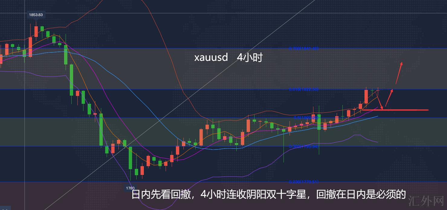 文接上回,受通货膨胀担忧和挥之不去的地缘政治风险支撑,因市场在等候核心通货膨胀报告,以分析美联储的加息轨迹。另一面,美联储加息预计及美债收益率持续攀升制约了黄金价格上涨趋势。日K线收盘一根光头光脚大阳线,直接收回了在此之前的下挫约一半失地,同期K线结构连阳上涨收高,短线更深一步保持态势。日K线持续看上升。4小时经历在此之前的接连下探回涨,低点启稳整理再配合蓄势上升的走法,立住1810后面形成买方放量,今日的回撤支撑点即是击穿转换支撑点1810.此位由顶底转换。由压力转换成支撑。均线指标开始买方发散。短线看涨趋势不改。