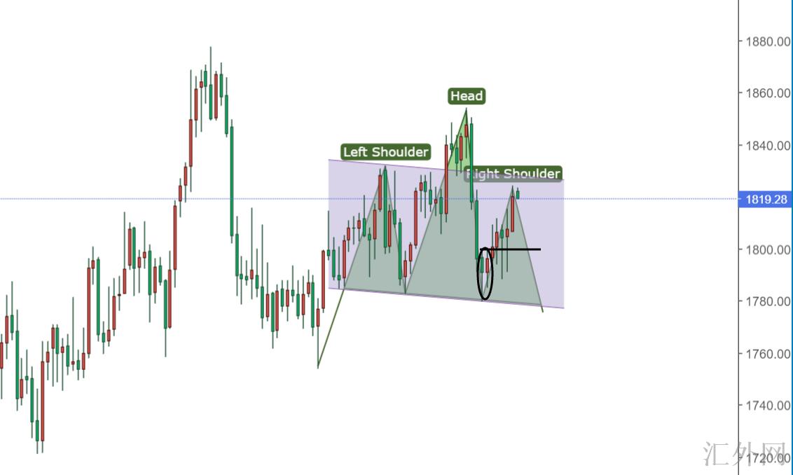 再来看一下信号,这个形态你们应当都不陌生,作为头肩顶的存在,或许还会有不少人执迷于前期高位1832,由于只有到位32后面才可形成平行双肩,其实这个想法太过于书本化,不少时候的形态你要跟目前K线的排列做调动,比如这个头,很显著右侧的下挫角度要愈加偏激,它的整体震荡方向就比较偏下,你认为趋势是多,是由于短周期内1780的震荡拉涨是个偏上运行,要真是审视这段中期空间,其实依旧偏下的。