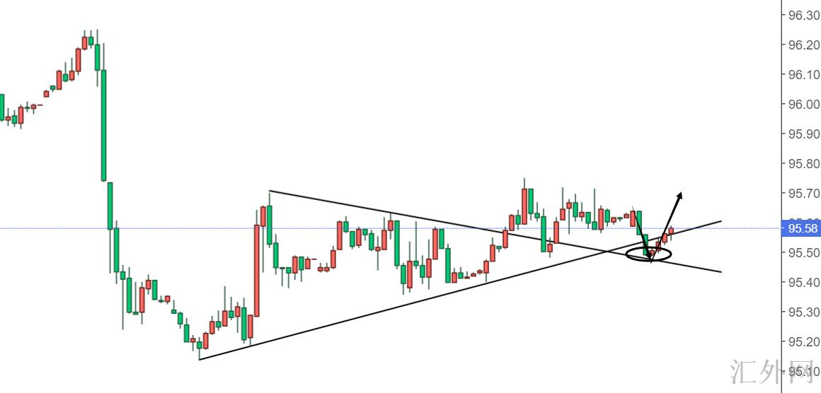 美元最后一波下挫的起步点是在96.3,同期也是欧中央银行利率会议所致使的下挫,我早就在文章和直播当中称过,这是个预计下挫,并不是定价下挫,那美元想要看多的第一计划肯定要设在这个位置,就算美元小时线在平盘,可两段交叉震荡后面,今天95.4就是看回弹的最好机会,刚好它亦在下午给到了,这就赶得很巧。
