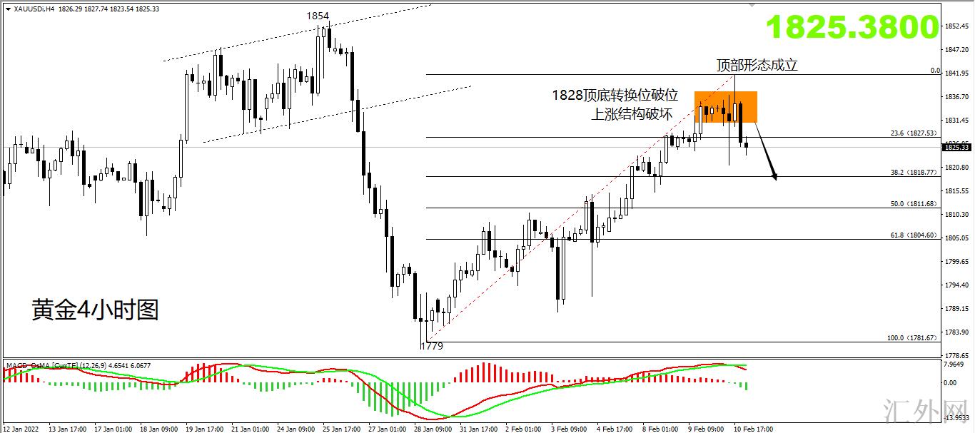 短线4小时层面,昨天的中阴线朝下击穿了顶底转换位1828一线,上涨结构遭到损坏,而且形成了吞没的顶部形态,MACD指标快慢线高点死叉,放量卖方能量,日间预期将持续下探,打破昨天低位1820一线,需求注意的是1815-1813左右的强支撑,短线空单在新低后便可以退场,本轮4小时的下挫强度将令比较核心,若下挫较为犹豫反复,则注意此段跌穿起涨点1780的几率将令减小,日间短时间内的下探计划分别注意1818,1813,1808.