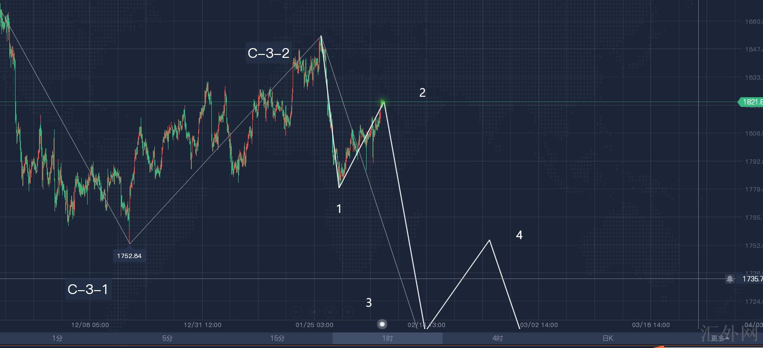 1、C-3浪细分:根据已有行情,我们仍可又一次将C-3浪又一次细分成5浪结构,如图中白色线所示。从1877起的C-3浪已走完成C-3-1浪(1877-1752),当前需判定的是C-3-2浪能否走完!依据波浪理论我们可知,2浪一般回撤1浪的0.39-0.79倍,即顶部理论上位于1851左右,行情最高企及1853后回调。当前可将C-3-2看为终结,行情正处在C-3-3浪增速下探当中!