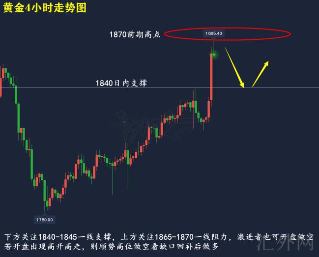 黄金技术分析来分析,日K线上,星期五黄金在白盘马上跌向MA10日移动均线后展开回涨上升,并在刺破上缘后适当回调,报得带上下影线的大阳,日K线上,目前技术分析超买,即便行情技术分析突破,但也切勿高点追多,谨防大幅回调又一次依托均线支撑上升;4小时上,星期五黄金在经历短线回踩后走震荡上涨行情上升,并在夜里创下日间高点后报得到垂阴线,目前布林带处在开口期,MA均线迈出双金叉,三线往上,呈买方排列,KDJ随机指标三线往上,到达超买,MACD指标红色量能柱开始显现,快慢线金叉往上,综合来说,黄金收得倒锤阴线,当前短时间仍有回调需求,推荐下星期一开盘先空后多,上方注意1865-1870一线压力,激进派也可开盘买跌,以下注意1840-1845一线支撑,若开盘显现高开高走,则顺势依托高位看空缺回补再抬高支撑执行买涨。