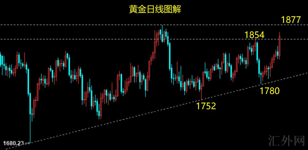 黄金,当前价格处在从1月抛压低位1780止跌的上涨周期,上周初保持冲顶1842,周尾回踩1822后星期五受避险提升推涨,并击穿1854到1865;日线图报得大阳,K线组合呈买方排列,预计下周会试探1877平行高位压力;由于此次上周还没有迈出38.2%以上的回撤修复,看多同期需小心避险减退后的抛压风险;