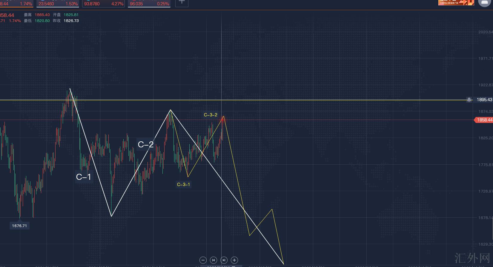 第二种或许:C-2浪已终结,行情处在C-3浪当中。至于C-3浪的细分上文已做分析,若行情处在C-3-2浪当中,则行情不会跨越1877前市高位;若刚去处在C-3浪大浪当中,则行情不会跨越1916一线,即大一级别的压力位在1877-1916!