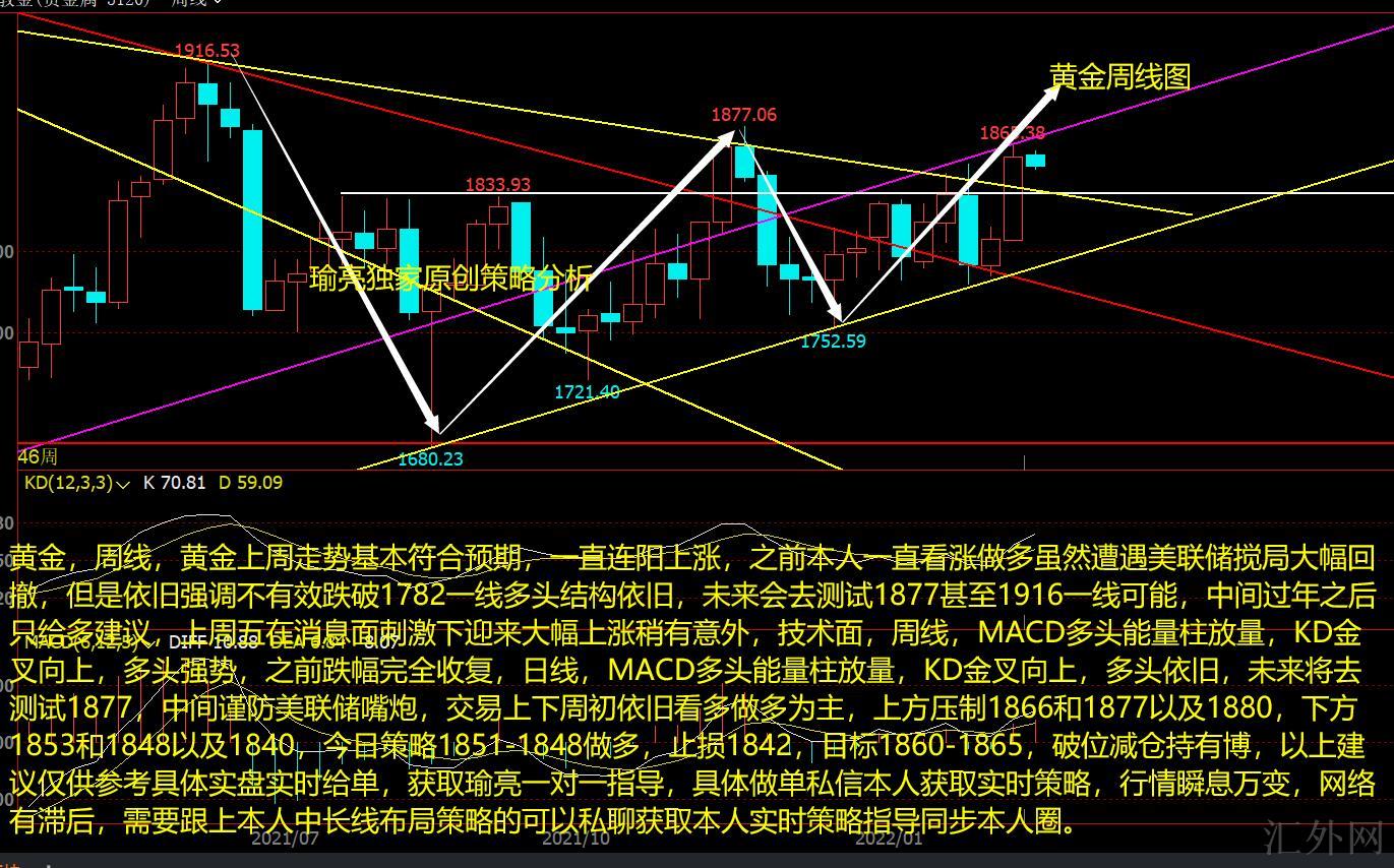 黄金,周线,黄金上周行情差不多符合预计,一直连阳上升,以前本人一直看多买涨尽管遭受美联储搅局大幅回撤,但是依旧强调不有效跌穿1782一线买方结构依旧,将来会去试探1877甚到1916一线或许,中间过年后面只给多推荐,上星期五在消息面刺激下面临大幅上升略有无意中,技术分析,周线,MACD买方能量柱放量,KD金叉往上,买方强劲,以前降幅完全收回,日K线,MACD买方能量柱放量,KD金叉往上,买方依旧,将来将去试探1877,中间谨防美联储嘴炮,交易上下周初依旧看涨买涨为主,上方抑制1866和1877以及1880,以下1853和1848以及1840,今日策略1851-1848买涨,止损1842,计划1860-1865,突破减仓持有博,以上推荐仅供参考具体实盘实时给单,获取瑜亮一对一指导,具体做单私信本人获取实时策略,行情瞬息万变,网络有落后,需求跟上本人中长线布局策略的可以私聊获取本人实时策略指导同步本人圈。
