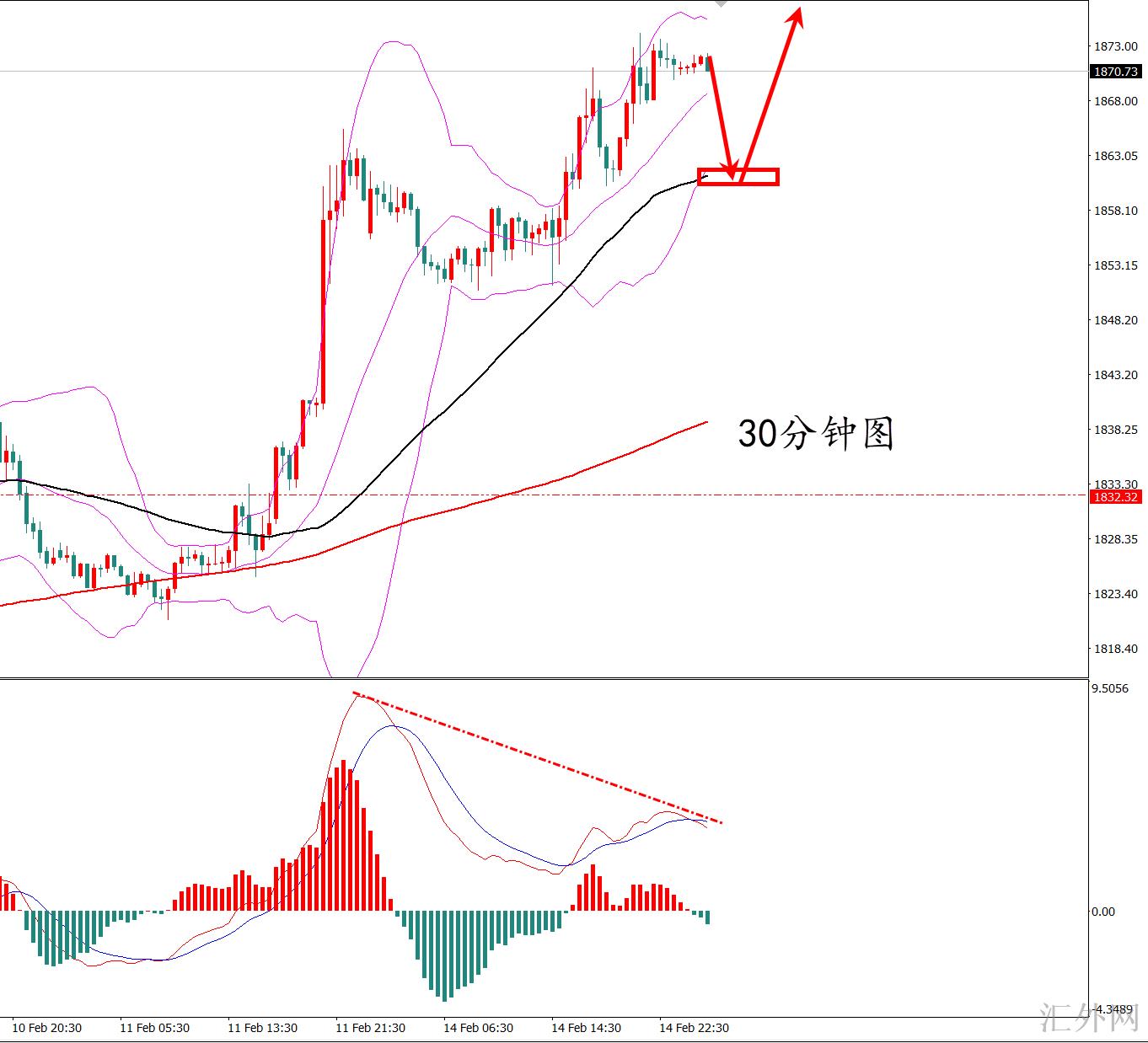 凌晨行情又一次的推涨高峰,但是30分钟上显现了背离态势,