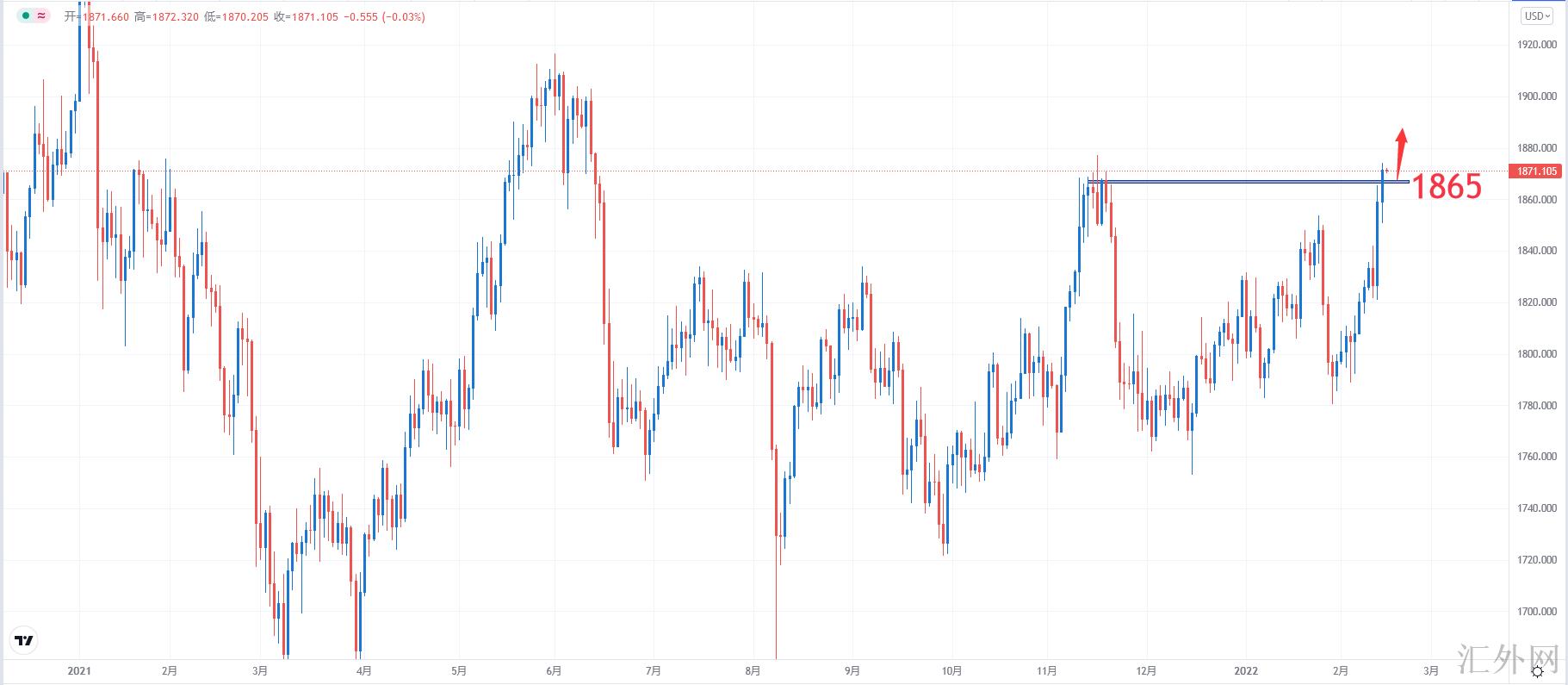 受于环绕乌克兰的地缘政治紧俏局势连续,致使投资人需求再次回暖,黄金现货星期一涨到去年11月中旬以来的最高水平1874.16美元每盎司。