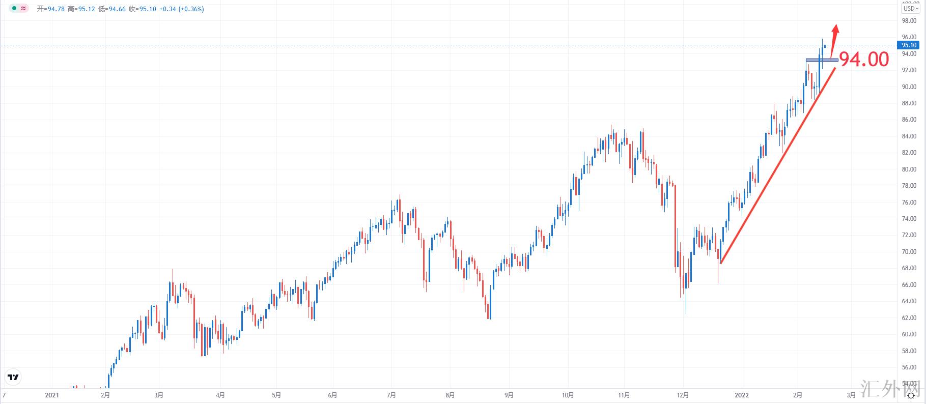 WIT原油最多涨差不多3%,创下2014年9月迄今高位到95.82美元每桶,俄罗斯和乌克兰之间的地缘政治紧俏局势使市场处在紧俏状态,而且也震荡率居高不下。