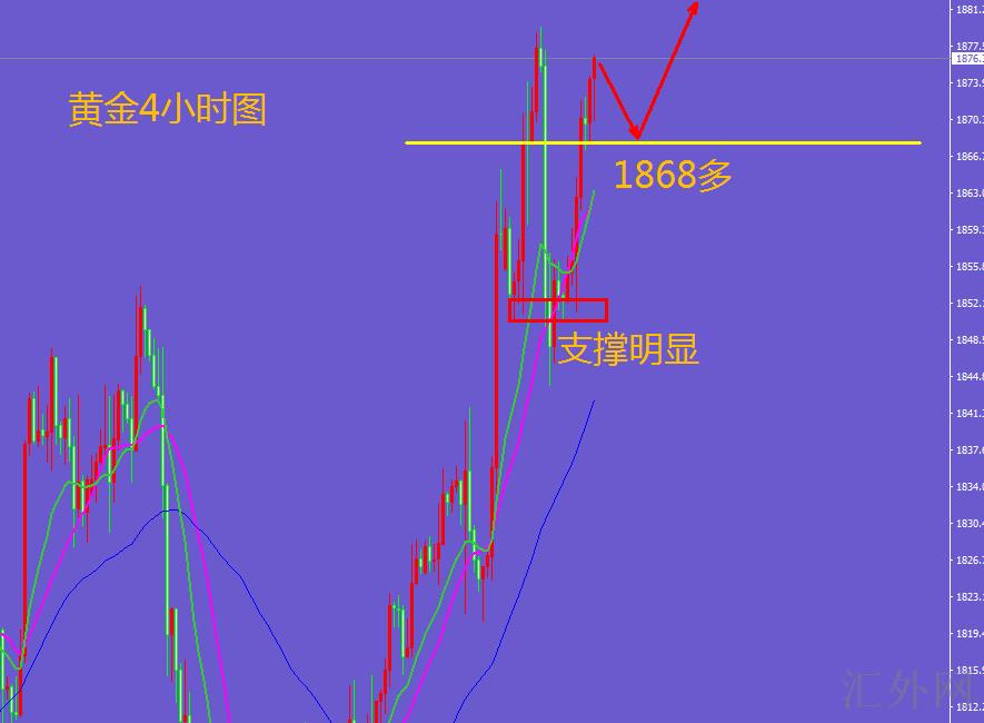 4小时图中,黄金在1850名置承受支撑,开始推涨起飞,消息面有好处多头黄金,黄金很难暴跌,回撤1868直接多单进场,上方看1880-1890名置,中轨又一次往上拐头,量能十足,跟上这段买方,头寸持续翻倍,机会难得!