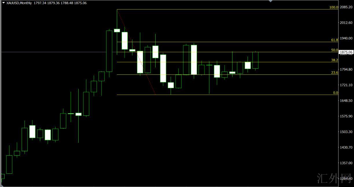 从上图月线上来说,黄金价格在黄金分割的50%位置左右纠结运行。若连续两天立稳去,那黄金价格后市会奔赴1916和1950。若无法立稳去,那就会形成日K线上的“M”头行情,也就是双顶行情。而硅谷的分析看好于在1879这里构筑双顶。从操盘法则角度来讲,遭遇重要阻力去买跌,符合左侧交易原则,损也好设。