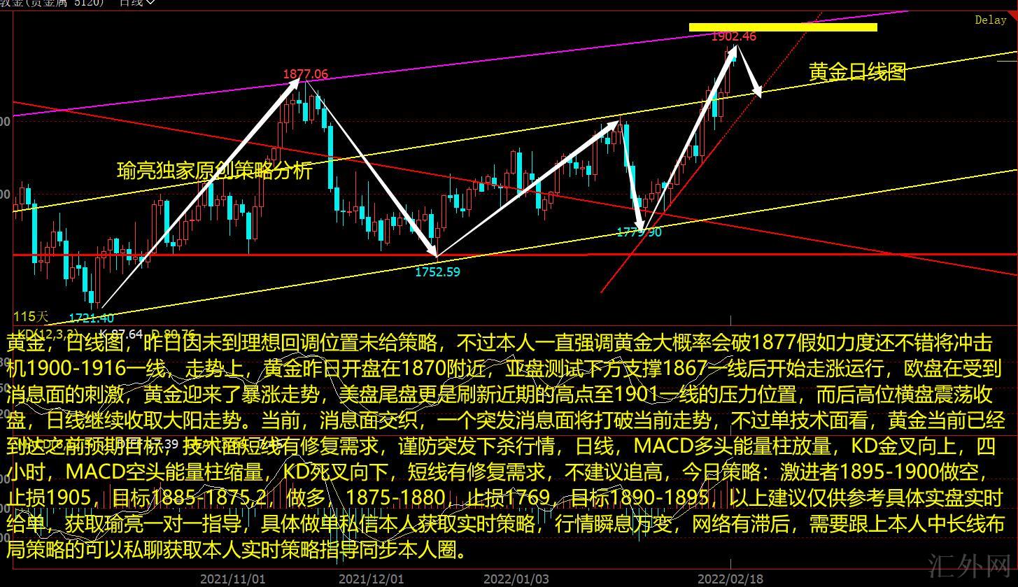黄金,日K图,昨日因未到理想回踩位置未给策略,然而本人一直强调黄金大约率会破1877假如强度还不错将打击机1900-1916一线,按计划达到,行情上,黄金昨日开盘在1870左右,早盘试探以下支撑1867一线后开始走涨运行,欧盘在承受消息面的刺激,黄金面临了大涨行情,美盘收盘更是创下最近的高位到1901一线的阻力位置,而后高点盘整震荡收盘,日K线持续收取大阳行情。目前,消息面交织,一个突发消息面将打破目前行情,然而单技术分析看,黄金目前已经到达以前预计计划,技术分析短线有修复需求,谨防突发下杀行情,日K线,MACD买方能量柱放量,KD金叉往上,四小时,MACD卖方能量柱缩量,KD死叉朝下,短线有修复需求,不提倡追涨,今日策略:激进派1895-1900买跌,止损1905,计划1885-1875,2,买涨,1875-1880,止损1769,计划1890-1895,以上推荐仅供参考具体实盘实时给单,获取瑜亮一对一指导,具体做单私信本人获取实时策略指导。