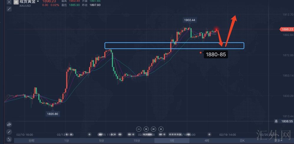 所以昨日美盘冲顶,遇阻于1900-02一线,亚盘回撤,下周行情以震荡看多为主,以下依托1980-85一线分批布局多,上方注意1900一线二次击穿情形!