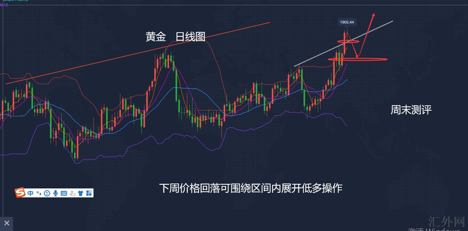 周末盘点,这周我们的工作重心放在黄金上,下周任然着重依旧看黄金,这周又一次收阳,单看周线,下周应当仍有高位,压力前高1917左右,实体压力在1906左右。然而618的位置在1920左右,也就是我们还要防止行情虚破一下回调。后期行情只有有效击穿并立住1920,买方才有更深一步的上涨空间,否则行情还会又一次回调或高点震荡。行情假使立住1920,左边高位1965应当挡不住,还会上2000甚至更高。周线支撑1860左右,刷新可以买涨,但是顶底转换的位置在1880左右,也就是行情要想上升,会在1880上方运行。日K线星期五收十字星,技术上有回调的需求,但是强劲买方假使直接往上击穿也是值得的。核心位置就要关注星期一如何开盘,以及1900能否能突破,接差不多1900或上方依旧不提倡太激进干多。下周操作安排1880到1860依旧多单预埋带,当前目睹这周的前高1902以及半年高位1916名置