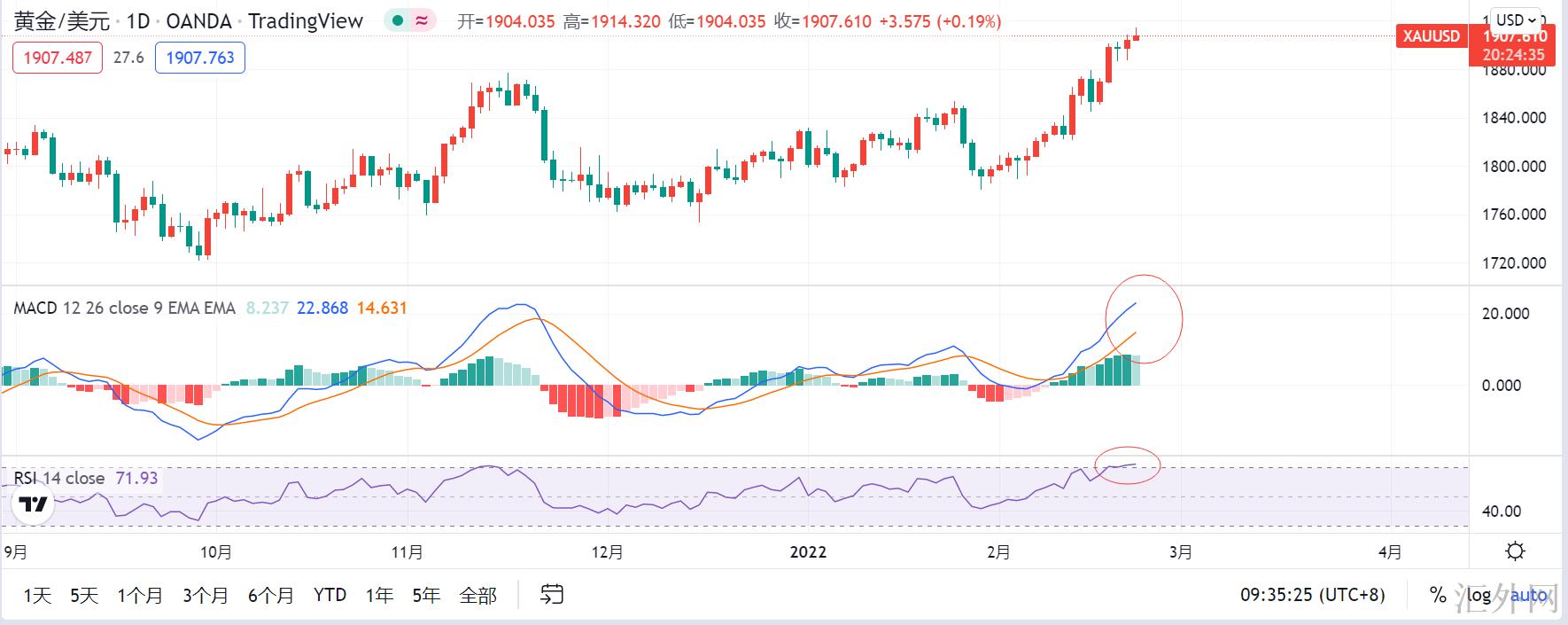 昨天开盘后面,黄金冲顶回调,在小时级别顶背离配合4小时级别死叉的情形下,我给出的思路是黄金将令在4小时级别迈出修正,不管是哪种修正模式,黄金全将在修正终结后面又一次上冲,构筑顶部形态后面再走大幅下探,但是隔夜受俄乌局势影响,黄金今天开盘后面跳空高开,但是这段冲顶并没有是我预计中黄金修正完成后面的上冲,由于黄金4小时的修正仍未终结,今天的这段冲顶仍未使4小时的快慢线在0轴上方金叉,反而使小时级别迈出了二次顶背离,所以我觉得黄金会在今天短线冲顶后面回调,持续走4小时的修正,直至修正终结后面,黄金还会又一次冲顶。