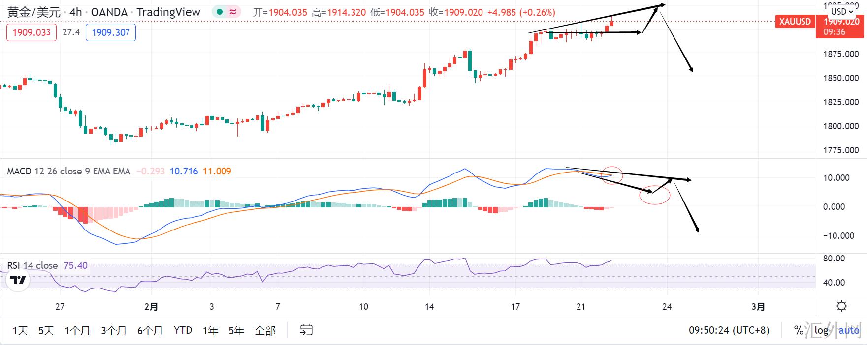 黄金日K线级别,伴随黄金隔夜的又一次冲顶,黄金整体的上涨趋势依然得以维持,日K线级别的MACD快慢线持续往上发散,未目睹萎缩粘合,而日K线级别的RSI终于到达了超买区,这对我如此一个大卖方来看是一件有益的事情,日K线RSI超买,表明黄金上方的上涨空间已经有限了,可以看为日K线级别的到顶信号,但是也只只能作为一个信号,并没有能作为入场根据。更牢靠的进场根据依旧要等日K线快慢线的萎缩粘合和4小时的顶背离形态,此前黄金都保持看多不变!