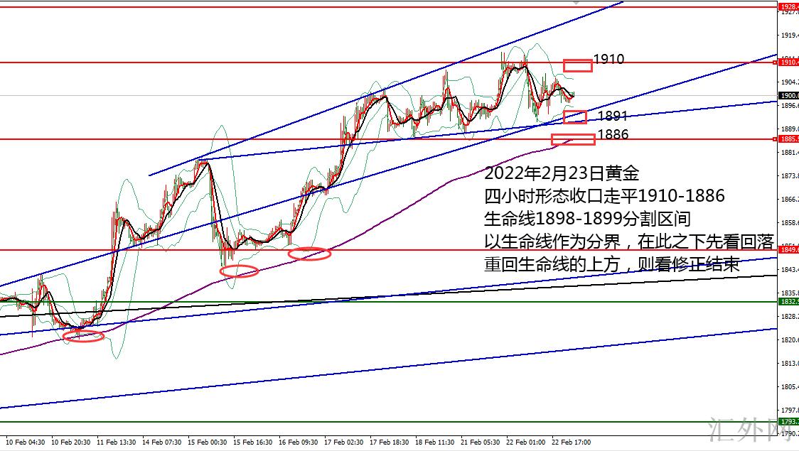 综合在此之前的支持压力位置,可以显著发现多重试探的位置1887-1886规模,也是四小时收口走平台的下缘支撑,也是日K线10日移动均线依托线,此处的支持作用会是关注的着重。