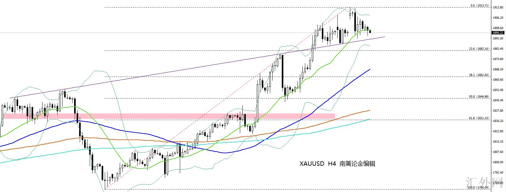 小时图中,以上星期五的行情为开始,历经周初结组成型上升通道结构,上缘被试探了三次,1907—1914的存在顺延推算,下一步高位位于1920一带。当前黄金价格1895,若今日有幸给到1920一带,则黄金在4H中大约率会成型顶背离形态,形态+位置=不错的测空机会。