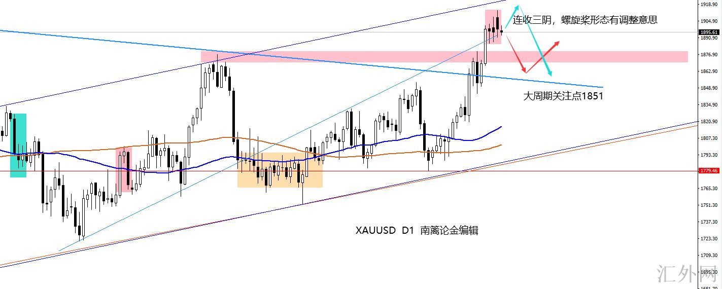 在日K上,黄金接连三日报收阴烛,而且收线上颇是有螺旋桨形态的意思,在高点螺旋桨,要么是到顶信号要么是中继形态。结合黄金被迫空及拉涨的弧度,不论如何,目前的黄金若是想要逆身而上,走直播中称的②形态(续涨),难度依旧有的。