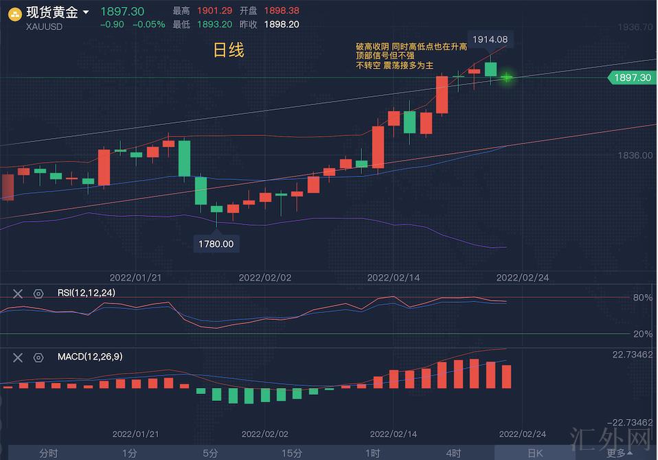 综上,日间接多为主,关注震荡筑顶情形,同期关注1小时指标修复情形。依旧那句话,在地区紧俏局势的情形下,行情容易显现大开大合,特别是当下技术分析再一次显现顶部信号,此时再配合地区紧俏局势缓和的话,很容易显现较大的回撤调动,大约率会打破刚所说的高点震荡区间下缘1885执行较大下探,所以有必要带好防守,最近地区紧俏局势所给行情导致的震荡,对于日间短线来讲异常没好处,整体思路就是如此。