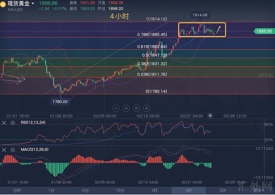 四小时可以愈加显著目睹,从1780上涨以来,除前期保持迟缓上涨,从1825开始就开放了强势推涨,也就是从地区紧俏局势开始以后,黄金就开放了显著的增速上涨兼轻微回踩,甚至是没有回踩的四小时级别接连上升,直到1900以后,回撤时间拉长,开始显现显著的止跌信号,整体盘整在四小时布林带上下缘1885-1910区间,同期1885也对应1810-1914上涨以来0.786斐波那契回撤位,日间可斟酌该位置支撑情形。