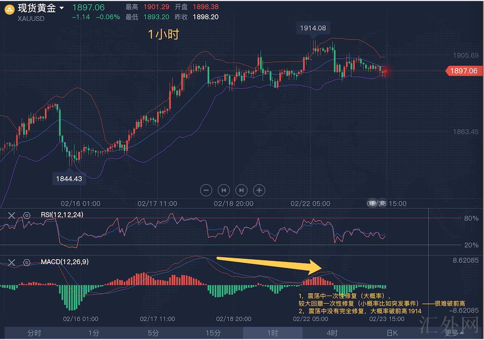 先说一次修复顶背离的情形,代表着快慢线要有效下穿0轴,可以在震荡中达到,也可以在较大回撤中达到,但由于今天星期三,基本分析并没有任何与黄金有关的报告或事件使行情有这么大的助推力去造成较大回撤(除非地区局势突变,该种无法预期,不议),所以我更看好于前者,也就是震荡中一次性完成二次顶背离的修复,对应刚刚说的四小时布林带下缘同期也是0.786回撤位1885左右,激进的话,特别是在比较清淡的白盘,也可以斟酌在一小时布林带下缘1893左右。