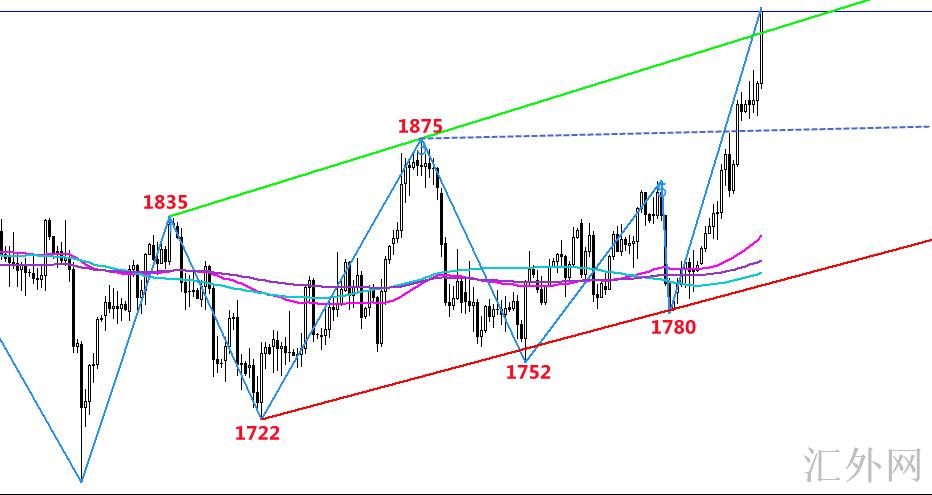 黄金最近受俄乌局势影响,面临了接连推涨,最多击穿1875强压位与1900关口,买方如虎添翼直奔1950高点。当下连1900关口都击穿持稳了,看多情绪异常高昂!在这样强烈的上涨趋势下,任何阻力都薄如白纸,就连1916阻力点与1920这个年度高点阻力都如同虚设,瞬间击穿到1950,黄金持续创下高位,空军节节败退,毫无压力可言。只要俄乌矛盾得不足减轻,市场的避险需求就不会降低,那么避险做多盘就会持续增长,支撑就会越来越强。当前看多趋势强烈,买方一飞冲天!日K线大阳推涨打开布林带上方空间,MA5—MA10均线保持金叉态势,MACD红柱能放量供应上升量能;周线也是四连阳接连推涨进而打开布林上缘空间,局势上异常强势。操作上尽量回踩入多顺势而为,不要盲目猜顶了,毕竟当下局势任何阻力都显得那么无力。当前徘徊在1950左右震荡,夜里着重注意1960阻力,与1930支撑。
