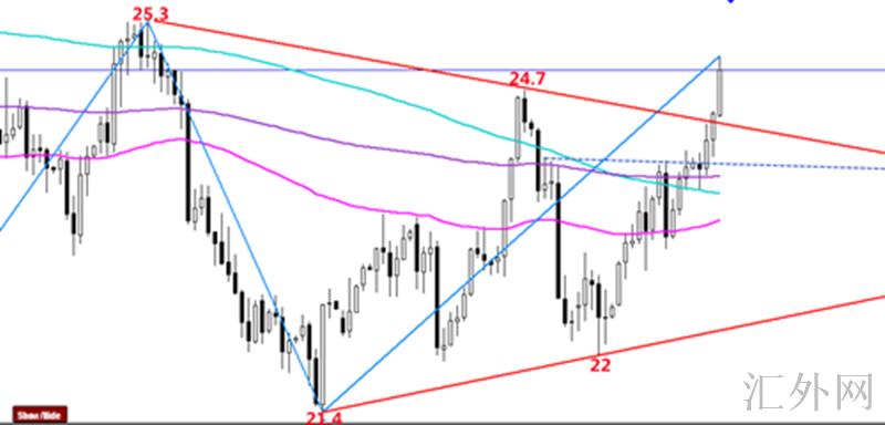 白银最近因俄乌局势进而避险受益,从22关键点位面临接连性推涨,当前已经击穿24关键点位到25高点左右。上升强度异常显著,日K线也是连阳上升,进而打开布林上缘空间,MA5—MA10均线保持金叉态势,MACD红柱能保持放量。此外白银已经击穿了25.3—24.7的下探趋势抑制点,成功击穿而且持稳了24关键点位,买方如鱼得水,看多情绪异常高昂。以前的一次起跌点就是25.3,所以接下去就注意25.3前高阻力位置,操作上回踩24.5左右入多,维持顺势而为。