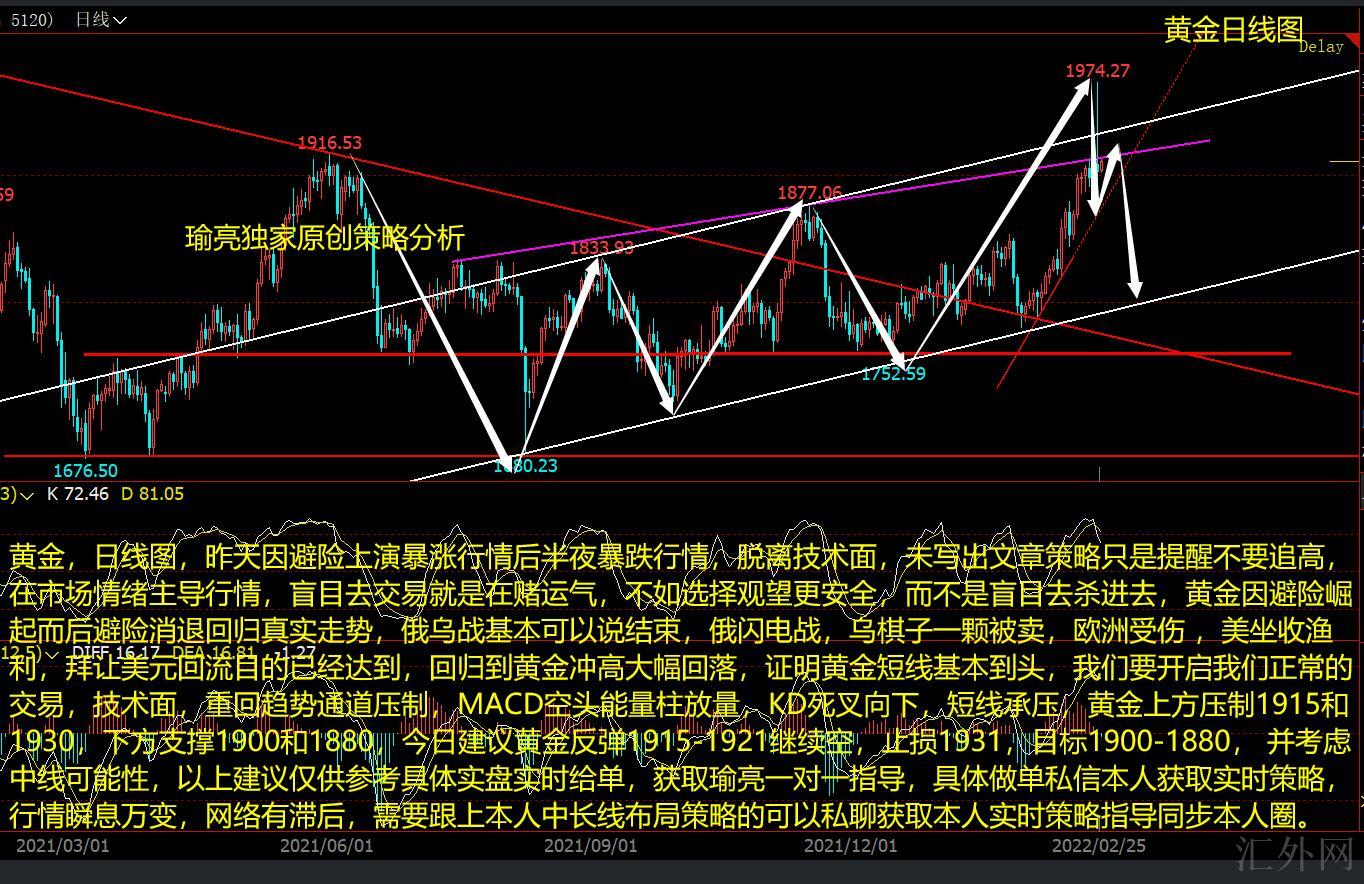 黄金,日K图,昨天因避险上演大涨行情后半夜痛跌行情,脱离技术分析,未写出文章策略导致警示不要追涨,在市场情绪统治行情,盲目去交易就是在赌运气,不如选择观望更安全,并非是盲目去杀进去,黄金因避险崛起而后避险减退回到真实行情,俄乌战差不多可以说终结,俄闪电战,乌棋子一颗被卖,欧洲受伤 ,美坐收渔利,拜让美元回流目的已经高达,回到到黄金冲顶大幅回调,证明黄金短线差不多到头,我们要开放我们正常的交易,技术分析,重返趋势通道抑制,MACD卖方能量柱放量,KD死叉朝下,短线遇阻,黄金上方抑制1915和1930,以下支撑1900和1880,今日推荐黄金回弹1915-1921持续空,止损1931,计划1900-1880, 并斟酌中线机会,以上推荐仅供参考具体实盘实时给单,获取瑜亮一对一指导,具体做单私信本人获取实时策略,行情瞬息万变,网络有落后,需求跟上本人中长线布局策略的可以私聊获取本人实时策略指导同步本人圈。