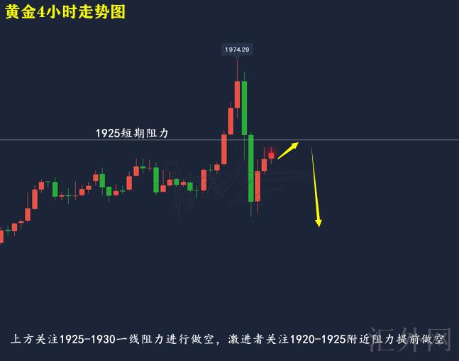 黄金技术分析来分析,日K线上,星期四黄金受避险情绪展开上升,并在创下高后上演探高回调行情,并在刷新日间低点后适当回涨,报得带上下影线的中阴,日K线上,今日行情开盘展开回涨,但均线抑制仍未打破,仍有持续下探的机会性;4小时上,星期四黄金白盘走震荡上涨行情上升,并在刷新日间高点后走震荡下探走跌,盘中跌朝下轨左右后回涨持于中轨左右盘整,目前布林带处在开口期,MA均线马上迈出双死叉,KDJ随机指标三线向前,MACD指标绿色量能柱连续放量,快慢线死叉朝下,综合来说,黄金当前仍未打破均线抑制,日间交易参考回弹买跌,上方注意1925-1930一线压力,激进派注意1920-1925一线压力。