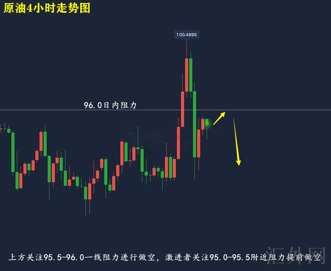 原油技术分析来分析,日K线上,星期四原油上演探高回调行情,盘中上升跌向低点后回涨,报得带上下影线的中阳,日K线上,今日行情持续依托MA5日移动均线上升,但上方均线抑制仍未打破,日间短时间仍有下探或盘整的机会性;4小时上,星期四原油白盘呈震荡上涨行情上升后走连阴下挫,并在跌穿中轨位置后回涨持于盘整,目前布林带处在开口期,MA均线马上迈出死叉,KDJ随机指标三线朝下,MACD指标红色量能柱开始缩量,快慢线马上朝下死叉,综合来说,原油日间短时间有遇阻需求,推荐依托95.5-96.0左右压力执行买跌,激进派注意95.0-95.5左右压力提早买跌。