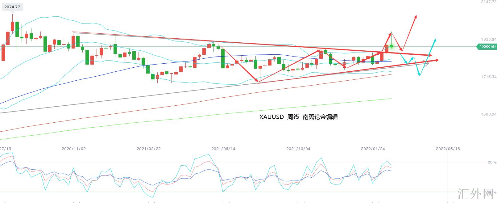 ②黄金周线影线过长上冲失利:同样的,三角形的突破回踩,1851仍是最简单的反阻力线。在行情没有作出任何反映以前,作为正常的突破存在,回踩关注反阻力线的支持即可。顺遂的话,这个计划就远大了,依照正常一倍量测算应为237美金,1853的初始值+237的成长值=2090美金,一个超越历史的存在。
