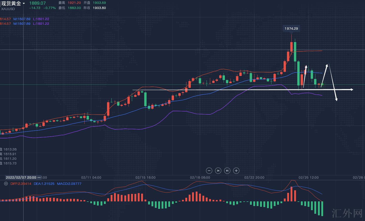 ①、黄金从趋势机构上很显著已经显现到顶信号,而且从日K线情形上金针探顶迅速回撤,显示弱势无疑,而且有机构大资金护盘卖方,整体趋势上笔者觉得卖方在不远还会席卷市场。但是表明的俄乌矛盾协商失利,俄持续出兵,这就让逝去的避险情绪再次重燃,或许会打破原定的下挫局势,大约率周初会先回弹再跌,上方抑制点位上留心1920-1930区域。