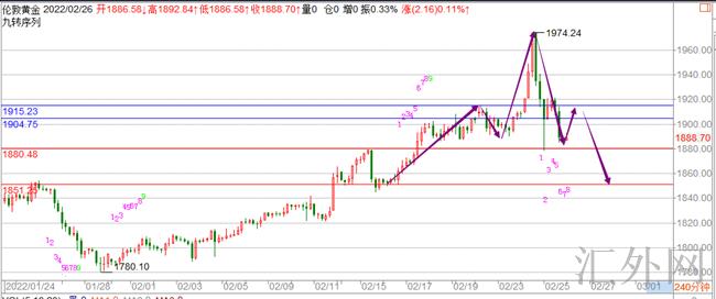 走一次五浪的趋势波浪,而且1850这里恰好是一浪的顶部,从1974这里回踩到1850就可以作为第四浪的回踩,假使接下去突破1880,那么一定要注意1850这里支撑,假使守稳1850,那么黄金或许还会有第五浪的上涨,且有机会会破1974高位。