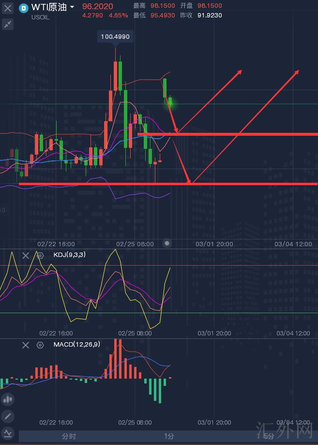 原油承受周末局势影响,早间高开低走,相较于黄金回调回弹遇阻不同,原油短线是高开低走持续看多行情,所以今天原油更倾向于低点看多。另一面,俄罗斯是产油大国,已经承受制裁,这周原油肯定会更深一步冲顶,而以当前这行情也很难看回补空缺,所以临时注意94-93支撑,上方看100关口,原油不止要关注局势的进度,还要关注俄罗斯被制裁的情形,当前被踢出SWIFT,进出口受限,那些依靠俄罗斯原油和天然气的欧洲各国预期很难受了,伤敌一千自损八百,原油价格势必仍有更深一步上升。