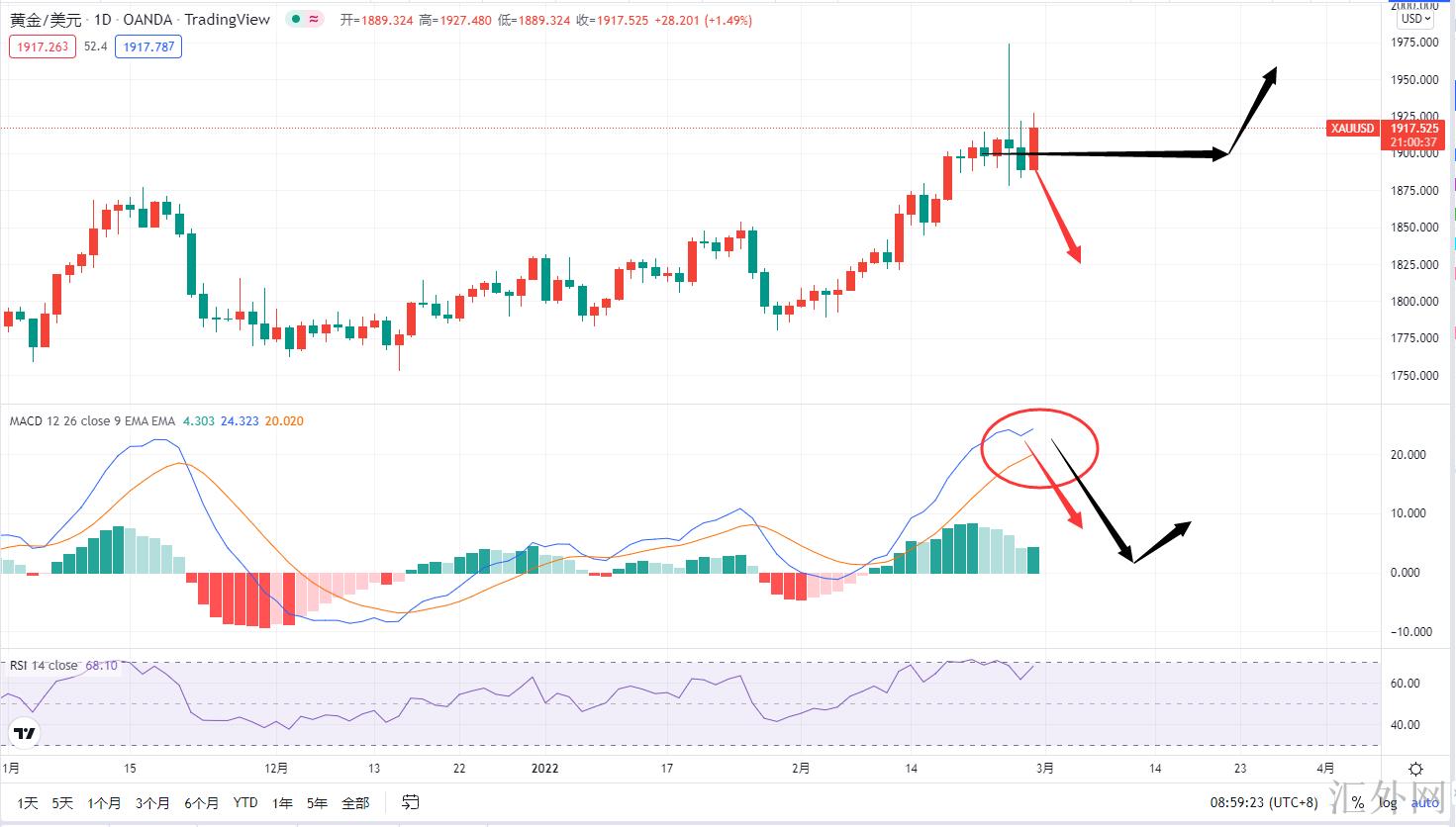 对于黄金的思路,并没有太多的收到俄乌局势的影响,一直均为看黄金震荡上涨完成筑顶,我在4小时顶背离成立以及日K线死叉后面进场买跌,但是承受俄乌局势的影响,黄金的震荡上升幅度太大了,特别是在星期四的迅速上冲,这致使我对黄金能否还会到顶都造成了怀疑,幸亏黄金迅速的冲顶回调,4小时级别的一次顶背离成立了,日K线级别的快慢线也开始萎缩黏合了,而且今天开盘后面黄金又一次跳涨,4小时快慢线在0轴上方又一次萎缩黏合,有机会迈出以前说的二次顶背离,所以截至到迄今为止,我对黄金的到顶依旧很有信心的。