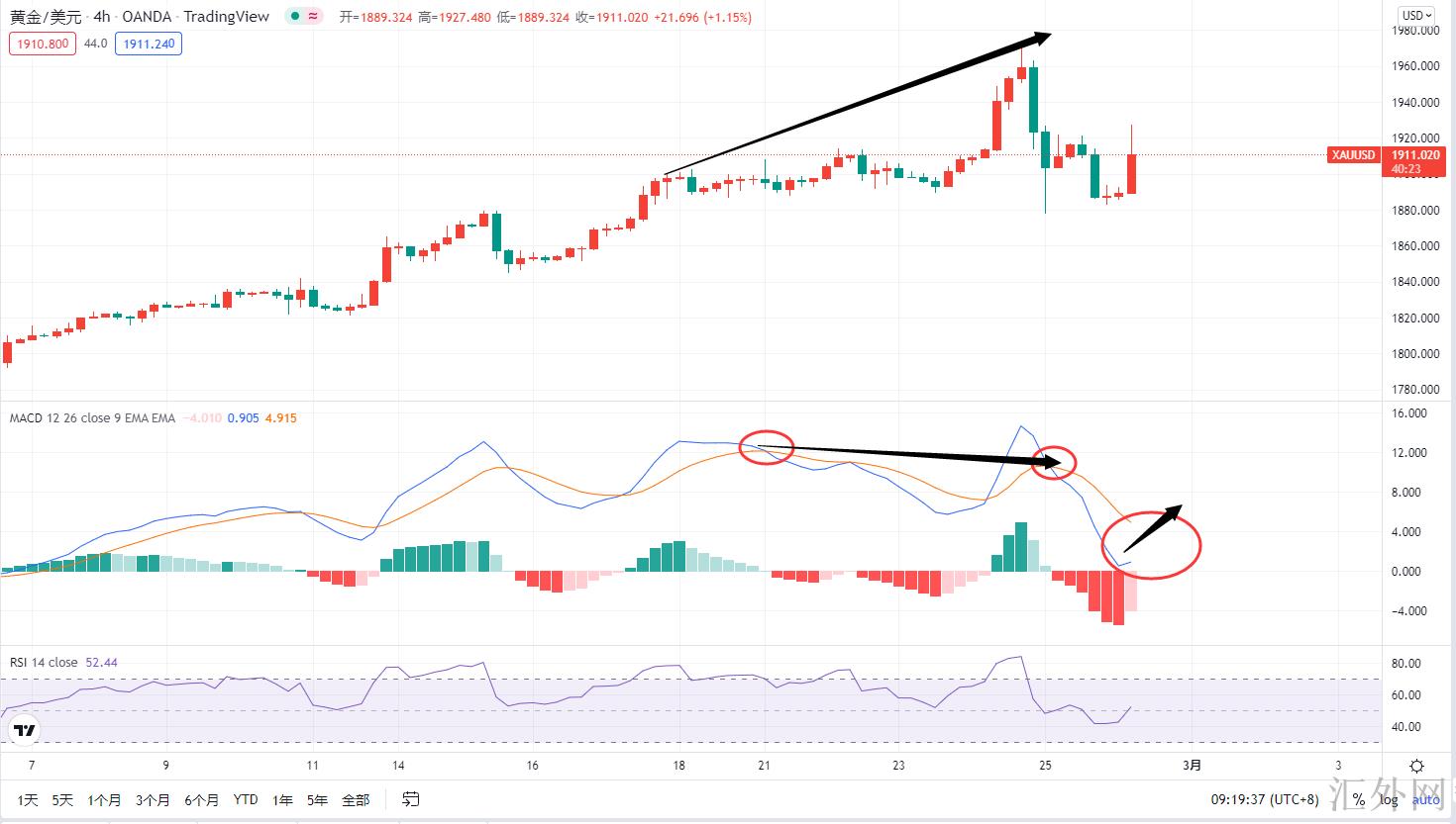 黄金4小时级别,说完了日K线的操作,接下去看短线,当前4小时级别已经迈出了一次顶背离,依照直播中所说的规划,不管4小时级别一次顶背离成立后面黄金会否迈出大幅下探,我全将进场买跌,但是这个一次顶背离显现的有些晚了,当下年纪大了熬不足那么晚了,就错过了星期四黄金的暴跌,那当前来说在今天跳空高开后面,4小时级别的MACD快慢线在0轴上方又一次萎缩黏合有金叉的机会,这就是以前所说的二次顶背离,4小时快慢线在金叉后面会持续动员黄金上涨,尽管不一定会迈出高峰,但是大约率会去到上星期五直播时所说的1950左右,假使二次顶背离成立,同期日K线快慢线也更深一步萎缩黏合,那就是进场买跌的最好机会。