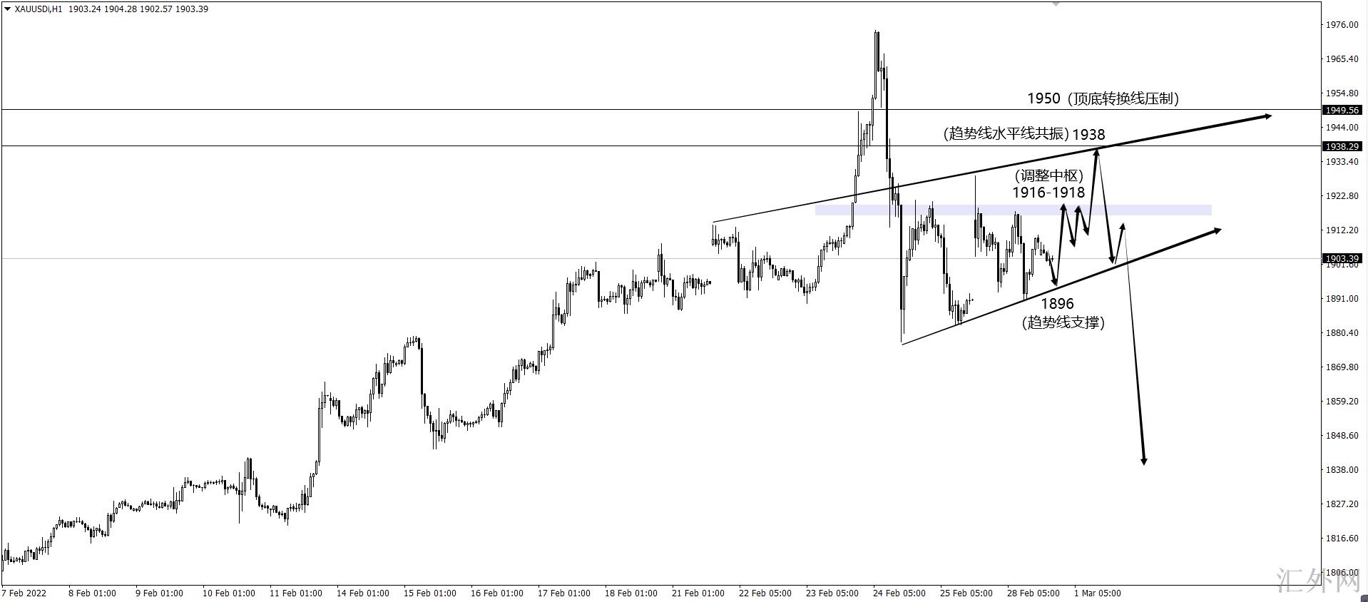 受于刚刚月线换线,假使月线得走上影线,则需注意1938和1950美元的抑制,布局中期卖方这两个位置是最佳的可能。此前,日间短线尚需注意1916—1918区间抑制,预计会显现短线调动,但空间会受限。我的交易预期是黄金直接上升,不走回撤,假使走回撤,代表着黄金摸底后还会显现上升。