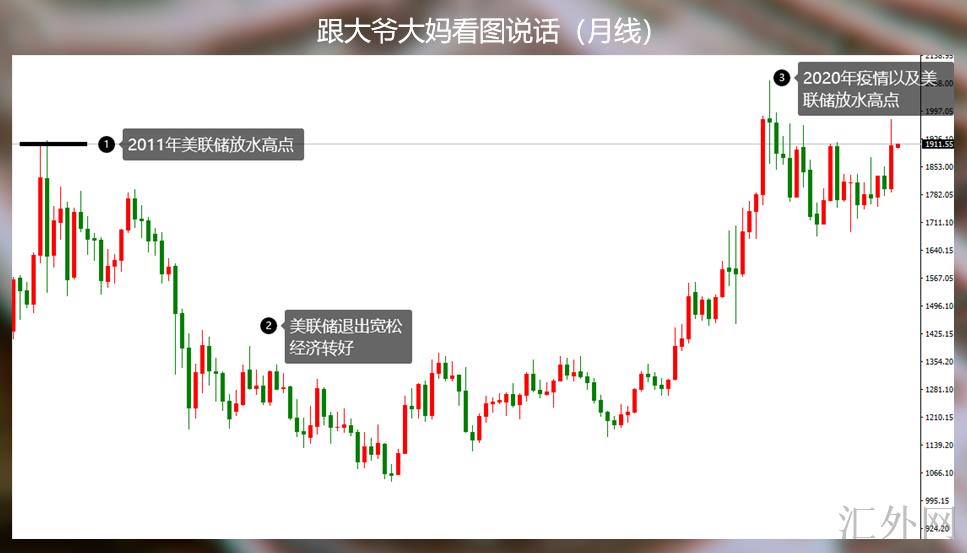 假使大爷大妈问你为何当下不能买,你就把k线图调出来,随后用月线给他们讲讲,具体你要这么说:目睹前面这两根线了吗?这是2011年的高位,位置是1918,当时金条应当是340-350块一克,当时在这有不少大爷大妈冲着高点涌入市场买黄金,也助推黄金的确是保持在高点了一年多,经济背景是08年的金融危机,美联储为了救世推行几轮QE,印钞、放水,但后来经济转好了,市场开始预计美联储撤出QE、加息,黄金就呼呼啦啦跌了下来,最低跌向240-260块一克,相当于一克亏了100块。