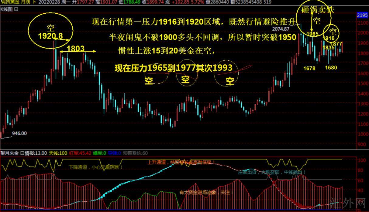 天天乌克兰天天避险,时间久了就是习惯了,昨日1920到1925区域也是买跌跌倒1912区域随后就是休息了,当下看然行情又是半夜偷袭上升,错过就是持续等候,当下市场许多是资本大鳄疯狂洗盘,配合避险消息,以及ETF增持13吨,显然什么层面均为配合让你追多,当下我们应当熟悉盘面清楚目睹月线阻力分别在1965和1977和1993区域。