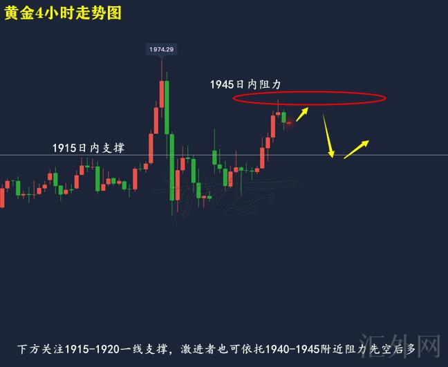 黄金技术分析来分析,日K线上,星期二黄金依托MA10日移动均线展开上涨,并在刷新上缘位置后适当回调,报得中阳,日K线上,今日行情开盘展开回调,恐会持续依托MA5-10日移动均线上升;4小时上,星期二黄金在经历适当盘整后走震荡上涨行情,并在今日刺破上缘后收倒垂阳回调,目前布林带马上开口,MA均线迈出双金叉,KDJ随机指标三线朝下,到达超买,MACD指标红色量能柱适当缩量,快慢线金叉往上,综合来说,黄金当前短时间仍有回调需求,日间推荐待回撤支撑左右买涨,以下注意1915-1920一线支撑,同期上方注意1940-1945一线压力也可执行买跌。